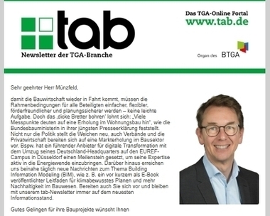 Durchschnittlich alle 10 Tage erscheinen die Newsletter von tab – Das Fachmedium der TGA-Branche. Damit informieren wir sowohl über allgemeine Branchen-News als auch Themenschwerpunkte in der TGA. Mit...