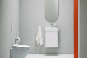 Dass PRO X für den Projektalltag entwickelt wurde, zeigt sich dort, wo im Budget meist Kompromisse erforderlich sind. So erfüllt die flüsterleise Silent Flush 2.0 Rotationsspülung der WCs die SIA 181 und die DIN 4109, sodass Schallschutz in der Planung kein Sonderthema wird. Die Armaturen mit Eco+ Kaltstart-Mittelstellung erreichen beim Waschtischmischer das EU-Energielabel A – ein direkt in die Ausschreibung übernehmbarer Nachweis. Erhöhte Hygieneanforderungen in Klinik, Pflege und Hotellerie lassen sich mit den optionalen, schmutzabweisenden Oberflächenveredelungen LCC und LCC Active erfüllen, ohne dass die Spezifikation das Serienumfeld verlassen muss. Und EasyFit 3.0 – die werkzeugfreie, selbstzentrierende Ein-Mann-Montage von Wand-WCs mit einfacher Justierung von Sitz- und Deckel – verkürzt die Montagezeit, kompensiert Einbautoleranzen und reduziert Reklamationen nach der Übergabe. Im Projekt bedeutet das kalkulierbarere Bauzeiten, vor allem bei vielen gleichartigen Einheiten.