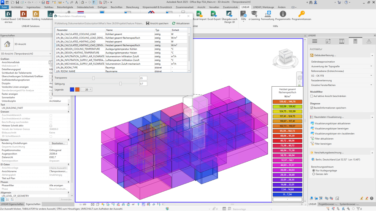 Mit dem aktuellen Release erweitert das Unternehmen Linear seine Werkzeuge für die BIM-konforme TGA-Planung um zahlreiche Funktionen. Mit zwölf erfüllten Kundenwünschen sind etwa die Hälfte der neuen Features direkt durch Anwenderideen entstanden. Das neue Raumbuchmodul ermöglicht die durchgängig BIM-konforme Verwaltung, Strukturierung und Nutzung aller Raumparameter als zentrale Datenbasis für Auswertung, Berechnung und Kollaboration über alle Planungsphasen hinweg – unabhängig davon, ob ein vollständiges CAD-Gebäudemodell vorliegt oder die Daten aus Excel stammen. Die bewährte Trassenplanung wurde um ein leistungsstarkes Berechnungsmodul erweitert. Damit können bereits in frühen Planungsphasen Kanal- und Leitungsdimensionen berechnet, dimensioniert und für die Raumbedarfsplanung genutzt werden. Die neue Raumdaten-Visualisierung ermöglicht die Visualisierung beliebiger Raumparameter – ideal zur schnellen Analyse und Bewertung von Planungsdaten.
