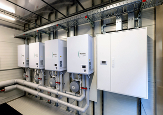 In der externen Heizzentrale kommen Luft/Wasser-Wärmepumpen der Serie Ecodan zum Einsatz, die je nach Anwendung unterschiedliche Inverter Technologien nutzen. Der Anforderung des jeweiligen Objekts entsprechend wird das Kaskadensystem mit vier oder sechs Wärmepumpenmodulen ausgestattet, wodurch eine Systemleistung von bis zu 84,0 kW möglich ist. Die einzelnen Einheiten der Luft/Wasser-Wärmepumpen-Kaskade sind mit patentierter Zubadan Inverter Technologie ausgestattet. Auch bei tiefen Außentemperaturen kann der Kältekreislauf mit HIC-Unterkühler und Flash-Injection-Verdichter den Kältemittelmassenstrom konstant halten. So erreichen die Wärmepumpen selbst bei einer Außentemperatur von bis zu -15 °C ihre volle Heizleistung. Die Anlagen verfügen über eine Max-COP-Regelung, die die einzelnen Einheiten aufeinander abstimmt. Darüber hinaus übernehmen die Einzelsysteme eine Redundanzfunktion, was zur hohen Betriebssicherheit beiträgt. Sollte ein Modul störungsbedingt ausfallen oder gewartet werden, liefert das System weiterhin zuverlässig Wärme.