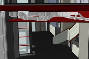 Zentrales Austauschformat zwischen dem Team von Phase 10 und den Fachplanungen war das IFC-Format. Vorrangig waren das Tragwerksplanung und TGA, die auf der Basis des in „Archicad“ erstellten Modells von Phase 10 ihre Fachplanungen entwickelten. Sie nutzten das Modell und entwarfen daraus ihre eigenen Fachmodelle mit spezifischen Parametern und Ergebnissen. Eine exakte Schlitz- und Durchbruchsplanung vor der Bauphase, in der Planung, erwies sich als enorm wichtig. Denn von ihr hing unter anderem ab, wie viele Kernbohrungen vor Ort und auf der Baustelle nötig waren. Ronny Erfurt beschreibt diesen Prozess so: „Aufgrund des Tragwerkskonzeptes haben wir sogenannte ‚No-Area‘-Bereiche festgelegt, in denen die TGA-Planung ihre Installationen führen konnte. Wir starteten parallel die ‚Layoutplanung‘ und definierten die Wand- und Fußbodenkonturen. Diese Planbasis übernahmen wir anschließend in die Ausführungsplanung. Alle zu klärenden Punkte wurden ab diesem Zeitpunkt immer wieder in den Koordinationssitzungen und Baubesprechungen diskutiert und die Ergebnisse ins Modell übertragen. Ganz ohne Kernbohrungen konnten wir jedoch nicht bauen. Denn wo sich Nutzungsanforderungen über den Planungszeitraum veränderten, waren sie trotzdem vereinzelt nötig.“