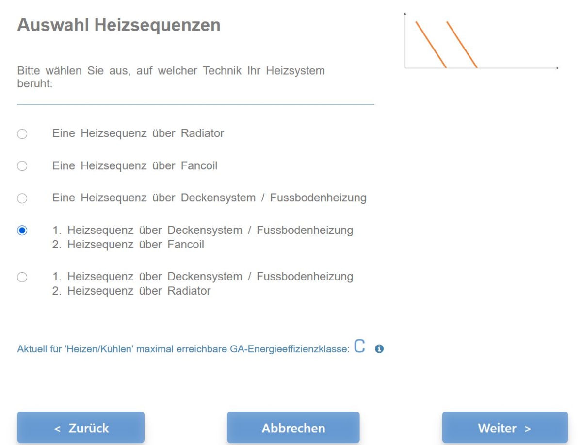 Bild 2: Teil eines Interviews: Das „Auteras“-Tool fragt nach den Wünschen bezüglich der Gewerke Heizen und Kühlen. Gleichzeitig wird die GA-Effizienzklasse ermittelt (unten rechts, hier C).