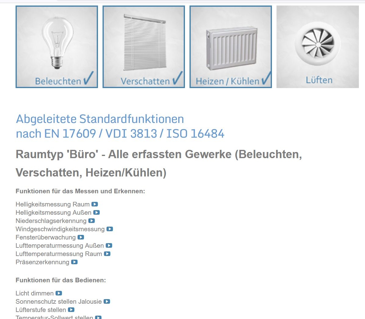 Das Generieren eines Automatisierungskonzepts aus Standardfunktionen durch die KI gehört bereits zur LPH 3. Obwohl diese Standardfunktionen nur innerhalb der KI verarbeitet werden und der Nutzer sie für seinen Entwurf nicht zwingend braucht, werden sie am Bildschirm (Bild 3) und bei Bedarf als Datei ausgegeben, wenn er sie z. B. nach der neuen BIM-Raumbuch-Richtlinie VDI 6070 dokumentieren möchte. Hilfreich sind sie zudem, um die automatisch generierten Konzepte im Nachhinein zu verstehen. Sie sind daher auch als Basis für Funktionsbeschreibungen in späteren Ausschreibungstexten nutzbar. Eine Erläuterung der KI-Ergebnisse bietet der Assistent auch hier für alle Funktionen als Erklärvideos an.