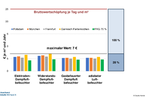 Aus dem Verhältnis zwischen der Bruttowertschöpfung der Mitarbeitenden und den Kosten für die Befeuchtung kann direkt abgeleitet werden, dass sich ein Befeuchtungssystem wirtschaftlich schon dann lohnt, wenn damit wenige Stunden an Arbeitsausfall aufgrund von Atemwegserkrankungen vermieden werden. Die Kosten von 7 Euro/m² zeigen den hier ungünstigsten Fall für den Energieaufwand. Wird dieser Wert mit der auf die Fläche bezogenen Bruttowertschöpfung von 25 Euro je Tag und m² verglichen, so entsprechen die anfallenden Kosten von 7 Euro je m² und Jahr lediglich 28 % der Bruttowertschöpfung eines einzelnen Tages.