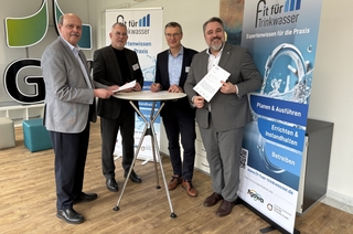 Partnernetzwerk „Fit für Trinkwasser“ erweitert (v.l.): Clemens Schickel (BTGA), Volker Meyer (figawa), Dr. Wolf Merkel (DVGW) und Daniel Föst (ZVSHK).