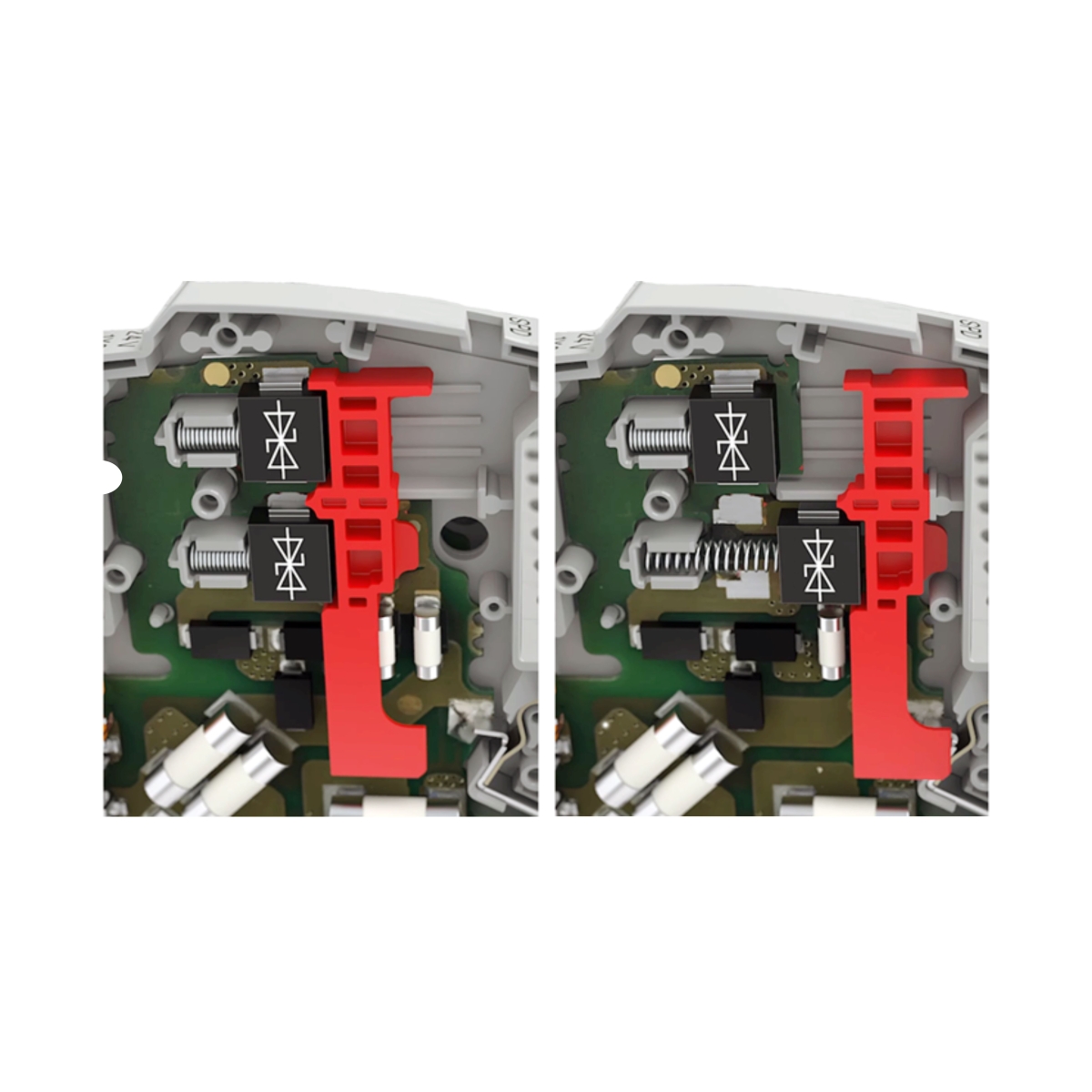 In modernen SPDs zum Schutz von signalverarbeitenden Netzen werden thermisch aktivierte Abtrennvorrichtungen oder Kurzschlussmechanismen verwendet. Die Leistungsfähigkeit dieser Vorrichtung wird auf Grundlage der mit der IEC 61643-21 Ed.2 eingeführten zusätzlichen sicherheitstechnischen Prüfungen nachgewiesen. Im Betriebszustand ist die TVSD (Transient Voltage Suppressor Diode) elektrisch mit dem zu schützenden Signalkreis verbunden. Das grundlegende Funktionsprinzip der Abtrennvorrichtung besteht darin, die TVSD im Fall einer Überlast durch Verschiebung aus dem Signalkreis herauszutrennen. Um dies zu erreichen, wird die TVSD mit einem Niedertemperaturlot auf die Leiterplatte gelötet. Eine Feder kontaktiert sich mit der TVSD. Diese Anordnung fungiert als temperatursensitiver Schalter. Die Lötverbindung der TVSD ist so ausgelegt, dass sie der mechanischen Kraft der Feder unter normalen Betriebsbedingungen dauerhaft standhält. Kommt es zu einer Überlastung der TVSD, treten Leckströme auf und die TVSD erwärmt sich. Wird eine definierte Temperatur erreicht, schmilzt das Lot und die Feder verschiebt die TVSD in eine festgelegte zweite Position. Die TVSD ist aus dem Signalkreis herausgetrennt. Durch die Bewegung der TVSD verschiebt sich darüber hinaus ein Kunststoffelement, das die Abtrennung auf der Front des SPD anzeigt und die Fernmeldefunktion auslöst (s. Bild 1).