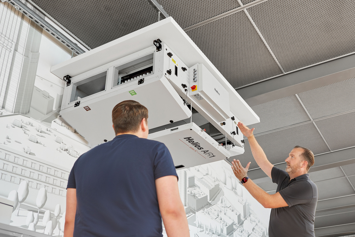 Beispiel: Bei 1.800 m³/h Luftbedarf können zwei dezentrale Helios-Geräte vom Typ „KWL Yoga 1000“ eingesetzt werden. Voraussetzung ist die Möglichkeit zur Führung von Außenluft (ODA) und Fortluft (EHA) sowie der Anschluss an Kondensatablauf und Stromnetz. Für Umkleiden und Duschräume könnte man dann eine separate RLT-Anlage planen oder sie gegebenenfalls mit einem dezentralen Abluftsystem ausstatten.