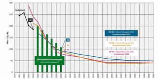 Hierbei wird zunächst ein Referenz- oder Basisszenario aufgestellt, in welchem die bereits bestehenden oder erwartbaren Politikmaßnahmen abgebildet werden (im Projektionsbericht: „Mit-Maßnahmen-Szenario“ – MMS). Resultiert aus dem Referenzszenario eine Ziellücke, erfolgt die Erstellung eines Zielszenarios unter Berücksichtigung zusätzlicher THG-Minderungsmaßnahmen (im Projektionsbericht: „Mit-Weiteren-Maßnahmen-Szenario“ – MWMS). Die zusätzliche THG-Minderungswirkung, die sich durch die zusätzlichen Maßnahmen unter Berücksichtigung von Wechselwirkungen mit bestehenden Maßnahmen ergibt, kann gegen das Referenzszenario abgeschätzt werden.