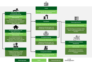 Weiterhin führt die Studie an, dass die Wärmewende im Gebäudebestand einen komplexen Transformationsprozess mit vielen beteiligten Akteuren darstellt. Neben der Politik sind private Eigentümerinnen und Eigentümer, Wohnungswirtschaft, Energieversorger, Handwerk und Energieberatung entscheidend (s. Bild 3). Hemmnisse bestehen insbesondere in hohen Investitionskosten, Informationsdefiziten, regulatorischer Komplexität und dem Fachkräftemangel. Folgende flankierende Maßnahmen sind daher zur Zielerreichung unverzichtbar: Informations- und Beratungsangebote, Sanierungsfahrpläne, Qualifizierungsoffensiven im Handwerk sowie sozial ausgerichtete Förderinstrumente zur Sicherung der Akzeptanz.