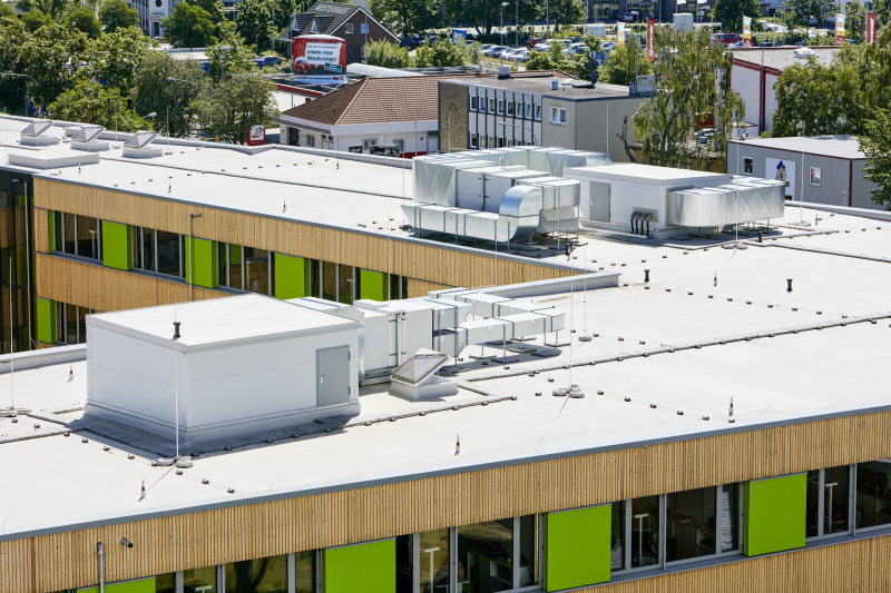 In dem Neubau der Stadtwerke Lübeck kommen hohe Dämmstärken und dreifachverglaste Fenster zum Einsatz, so dass das Gebäude eine extrem hohe Dichtheit erreicht. Um eine ausreichende Frischluftzufuhr bei minimalem Energieverlust sicherzustellen, leistet die Haustechnik einen wichtigen Beitrag. Die Lüftung wurde mit einem Wert von 20 m3/(h Person) so ausgelegt, dass mit dieser die komplette Belüftung des Gebäudes möglich ist. Die Lüftungsanlagen, die auf dem Dach aufgestellt sind, wurden mit einer effizienten Wärmerückgewinnung ausgestattet, die einen Wärmebereitstellungsgrad von über 90 % erzielt. Der Stromverbrauch wird dadurch reduziert, dass die Anlagen nur während der Nutzungszeit in Betrieb sind. Die gesamte Lüftung hat einen sehr geringen Druckverlust aufgrund deutlich vergrößerter Filterflächen und einem Kanalnetz mit geringen Luftgeschwindigkeiten.