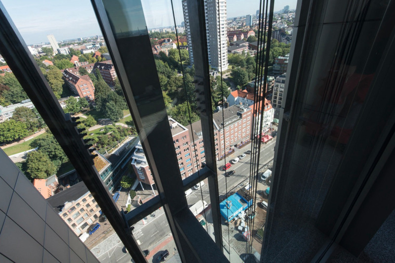 „Damit hat Hamburg Deutschlands höchsten gläsernen Außenaufzug. Bei der individuellen Anfertigung der Aufzugsanlage haben wir neueste Technik eingesetzt und die besondere Architektur des Kristalltowers berücksichtigt“, so Geschäftsführer Bernd Hütter. Die Aufzüge bewegen sich ohne Schacht entlang der Fassade. Die Scheiben der klimatisierten Kabinen sind beheizbar und bestehen aus Sicherheitsglas. Den Strom nimmt die funkgesteuerte Anlage über einen Abnehmer an der Kabine auf, so wird kein Hängekabel benötigt. Mit einer Geschwindigkeit von 2,5 m/s befördert jeder Aufzug bis zu 13 Personen.