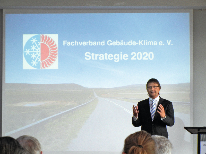 Hierbei sind nicht nur die regulatorischen Entwicklungen wie die bevorstehende F-Gase-Verordnung, die Ecodesign-Richtlinien oder EnEV und EEWärmeG gemeint. Auch die zunehmende Konkurrenz im Verbände- und Branchenwettbewerb stellt die gesamte TGA vor einen Scheideweg, wie Günther Mertz in der mitreißenden Vorstellung der „Strategie 2020“ herausstellte. „Wir müssen als starker Verband mit einer Branchen-Stimme sprechen“, betonte er. „Wir sind eine Branche, die es sich bislang nicht leistet, einen technisch-wissenschaftlichen Kongress durchzuführen. Angedacht ist dies mit dem BTGA und dem RLT Herstellerverband; bislang mangelt es an finanziellen Mitteln und personellen Ressourcen.“ Weiter sprach er die Idee an, ein „Haus der Gebäudetechnik“ mit Partnerverbänden der TGA in Berlin zu beziehen. „Wir werden nicht ernst genommen als Lobby-Verband ohne Adresse in Berlin.“ Gleichzeitig skizzierte er, wie der FGK diesen Entwicklungen begegnen und den Verband zukunftsfest machen will: