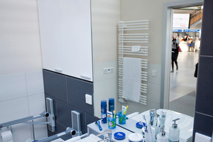Die Forschungsgruppe „Der Raum – Das Bad“ präsentierte auf der ISH 2015 das Ergebnis eines 18-monatigen Entwicklungsprozesses rund um die Gestaltung eines 4 m2 großen Badezimmers, der gebauten Realität im deutschen Wohnungsbestand. Die Forschungsgruppe mit den Industriepartnern Villeroy & Boch, Kermi, Pressalite Care, Hansa, Jung, Küffner Aluzargen und The Caretakers zeigte auf, dass auf der geringen Fläche keine Barrierefreiheit zu erzielen sei. Allerdings sei eine barrierereduzierte Lösung mit dem Ziel, den angestammten Wohnraum so lange als möglich selbstbestimmt bewohnen zu können, durchaus erreichbar. „Universal design“ auf 4 m2, fokussiert explizit nicht nur die Zielgruppe älterer Menschen, sondern möglichst breite Nutzergruppen aller Altersstufen, so eine These der Forschungsgruppe, sei ein Hauptanliegen in der Umsetzung gewesen. Hierbei sei allerdings auch das Einhalten der DIN-Kriterien der Barrierefreiheit nur schwer zu erreichen. Wichtig war es allen Partnern, dass in dem Muster-Kubus nur im Markt bereits erhältliche Produktlösungen verbaut wurden.