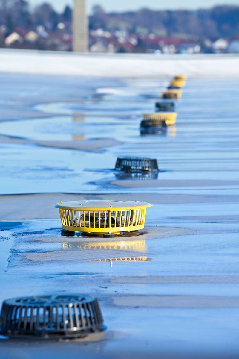 Langstreckenplanung für 28.500 m² DachflächeEin 28.500 m2 großes Flachdach, aber nur eine Gebäudeseite, an der die Fallleitungen montiert werden konnten. Das war die besondere Herausforderung bei der Flachdachentwässerung des Hallenneubaus der Fa. Carl Durach GmbH & Co. KG im bayrischen Todtenweis. Eine Druckströmungsanlage ebnet dem Regenwasser den Weg quer unter dem weitläufigen Dach entlang bis in eine Rigole und eine Versickerungsgrube.