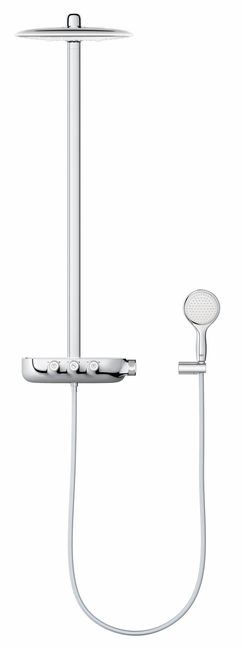 Grohe bietet für sein Duschsystem „Rainshower“ eine Bedienung mit „SmartControl“-Druckknopftechnologie. Damit lässt sich die Strahlart direkt an der Armatur per Knopfdruck auswählen und starten, die Wassermenge wird durch Drehen des Druckknopfes den persönlichen Vorlieben angepasst. Die intuitiv steuerbare Druckknopftechnologie ist nach Herstellerangaben unkompliziert und leicht zu handhaben: Ein Druck auf den Knopf mit dem intuitiv verständlichen Symbol für Kopf- und Handbrause sowie Strahlart reicht, um das Wasser wunschgerecht in Gang zu setzen. Anschließend lässt sich aufgrund der geriffelten Ränder der Druckknöpfe die Durchflussmenge – selbst mit nassen Händen – rutschsicher und präzise durch einfaches Drehen an die individuellen Bedürfnisse anpassen.