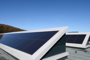 Die Südseiten der zehn Sheddächer hat Lamilux mit Photovoltaikanlagen mit insgesamt 712 Modulen bestückt. Immer in einem Zweier-Paar übereinander angeordnet, sind sie direkt in die eingespannten Sandwichplatten integriert. Die Nennleistung dieses „solaren Kraftwerkes“ auf dem Dach beläuft sich auf 89.000 Wp (Watt Peak).