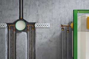 DoppelwandscheibeUnterputzarmaturen – etwa von Duschen oder Badewannen – in Ring- oder Reihenleitungen zu integrieren, ist mit üblichen Doppelwandscheiben schwierig. So erhöht sich durch den seitlichen Anschluss die Bautiefe. Das macht eine solche Installation entweder unmöglich oder es wird aus Platzgründen auf eine regelkonforme Leitungsdämmung verzichtet.