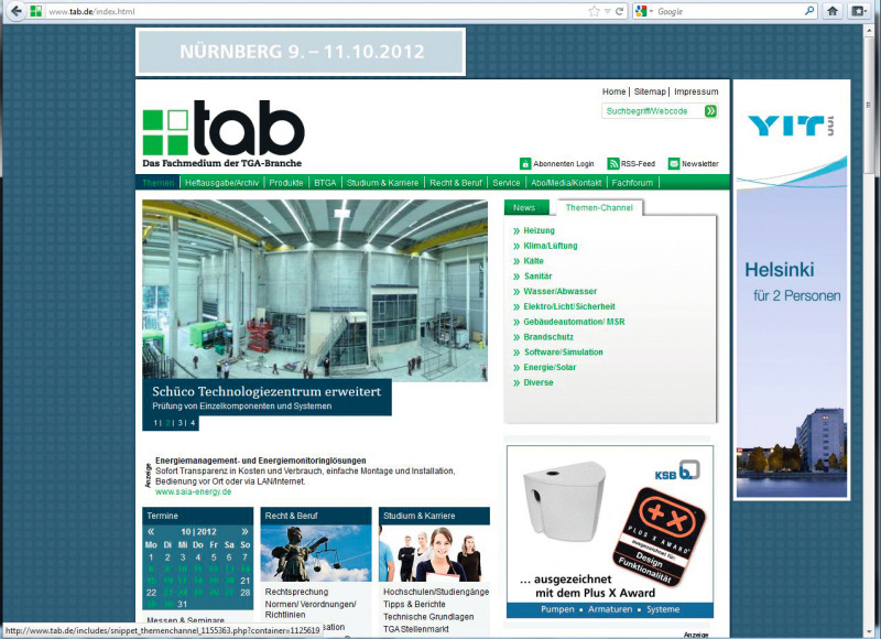 Mit den „Themen-Channel“ bietet die „tab – Das Fachmedium der TGA-Branche“ unter www.tab.de den sofortigen Zugriff auf die Wunschrubrik. Durch einen Klick auf Themen links oben oder dem Reiter neben den „News“ auf der rechten Seite können Sie einen von elf Themenbereichen auswählen.