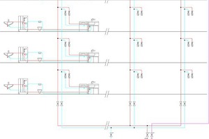 Innenliegende Zirkulation oder oben liegender Sammler?Trinkwasser warm (PWH) muss nach den allgemein Anerkannten Regeln der Technik oberhalb von 55 °C bereitstehen – sonst droht Legionellengefahr. Das sorgt im Schacht und in Deckenbereichen zusammen mit Heizungsrohren für einen hohen Wärmeeintrag. Dies wiederum erwärmt die dort verlaufende Trinkwasserleitung kalt (PWC) und beeinträchtigt die Qualität des Trinkwassers, wenn die Temperatur durch Stagnation auf über 25 °C ansteigt. Für Trinkwasser warm (PWH) können ein separat geführter oben liegender Sammler oder eine innenliegende Zirkulation die Lösung sein.