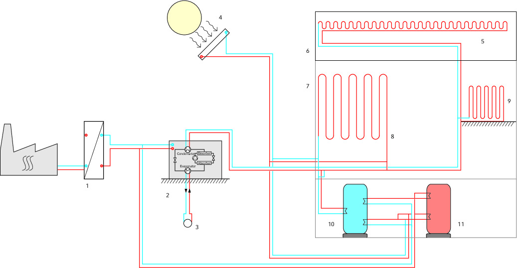 Der Strombedarf wird mit PV an Dach und Fassade gedeckt. Durch den intensiven Einsatz von Solarenergie wird ein Plusenergiehaus für das Gesamtgebäude ermöglicht. Auf den Dachflächen werden zusätzlich PVT-Module verbaut. PV-Module mit rückseitig integriertem Wärmeübertrager zur Solarthermie-Nutzung ermöglichen das Kühlen der Module und erhöhen den Wirkungsgrad. Gleichzeitig dienen die PVT-Kollektoren als ergänzende Wärmequelle für die Heizung und Trinkwassererwärmung. Da die PVT-Module unverglast und nicht gedämmt sind, kann nachts außerdem über Strahlung und Konvektion Wärme abgegeben werden. Im Sommer lässt sich daher durch die Kombination der Fassadenaktivierung mit der PVT über Nachtkühlung die sommerliche Erwärmung des Mauerwerks auf angenehme Temperaturen begrenzen.