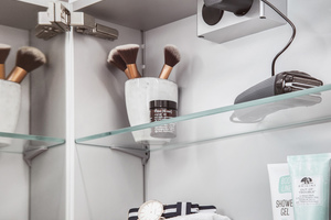 Dazu gehören u.a. der eloxierte Aluminiumkorpus, Doppelspiegeltüren, zwei Kristallglas-Einlegeböden, die über ein dezentes Trägersystem stufenlos individuell verstellt werden können, sowie eine moderne LED‑Beleuchtung.