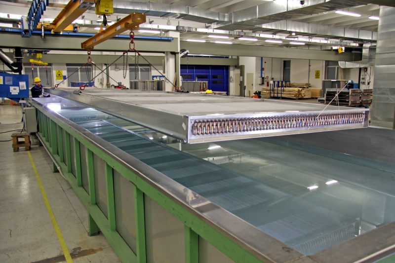 Ein Beispiel hierfür ist die Produktion von Wärmetauschern mit ovalen Kupferrohren. Diese patentierte Technik hat Refrion seit 2005 im Programm und laufend im Detail verbessert. Ovale Rohre kommen vor allem in Trockenkühlern zum Einsatz, in denen der maximale Druck im System 12 bar nicht übersteigt. Bei höheren Drücken kann sich das Ovalrohr verformen und „wird wieder rund. Und rund kann jeder“, wie Paolo Tonutti schmunzelnd erklärt. Der Knackpunkt bei der Herstellung ist die perfekte Verbindung von Kupferrohr und Aluminium-Lamelle bei der mechanischen Expansion – also der Aufweitung des Rohrs in der Lamelle –, ohne dass dabei Beschädigungen entstehen oder der Kontakt verloren geht. Nach anfänglichem Lehrgeld, das es zu bezahlen galt, hat man die Produktionstechnik über die Jahre immer weiter optimiert. Zu den Optimierungsschritten zählt zum Beispiel eine Reduzierung der Stärke der Alu-Lamelle. Die Lamelle musste in den Anfängen der Produktion noch dicker gewählt werden, da ansonsten bei der Aufweitung des Rohrs Risse entstanden. Das hat man mittlerweile sicher im Griff, so dass die Ovalrohre ihre Vorteile ausspielen können. Hierzu zählt vor allem ein bis zu 40 % geringerer Druckverlust im Wärmetauscher durch den kleineren Querschnitt in der Luftströmungsrichtung, was wiederum zu bis zu 15 % höheren Kühlleistungen führt. Dadurch können die Ventilatoren langsamer und leiser laufen und u.U. kann die Gesamtgröße der Einheit durch Verzicht auf Ventilatoren kleiner gewählt werden. Etwa 85 % der Trockenkühler aus dem Hause Refrion werden derzeit mit Ovalrohr geliefert; den Rest machen Sonderanwendungen mit rundem Kupfer- und Stahlrohr aus. Die Rohre aus rostfreiem Stahl kommen bei der Rückkühlung von aggressiven Flüssigkeiten zum Einsatz, wenn der Korrosionsschutz besonders gefordert ist. Und diese Produktgruppe soll auch künftig durch weitere Investitionen in der Produktion noch stärker ausgebaut werden.