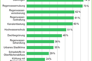 Dass ein Umdenken in der Branche stattfindet, bestätigen die Ergebnisse einer aktuellen Marktbefragung der Mall GmbH zum Umgang mit Regenwasser in Deutschland, Österreich und der Schweiz, an der im Sommer 2020 insgesamt 5.079 Personen aus Architektur- und Ingenieurbüros, Handwerk, Behörden, Hochschulen und dem Baustofffachhandel teilgenommen haben. 76 % der befragten Architekten, Ingenieure und Behördenvertreter sehen die dezentrale Regenwasserbewirtschaftung positiv und zeigen so den Paradigmenwechsel im Umgang mit Regenwasser, der seit zwei Jahrzehnten stattfindet. Deshalb erwarten insgesamt 98 % der Umfrageteilnehmer auch eine steigende oder zumindest gleichbleibende Nachfrage bei Maßnahmen der dezentralen Regenwasserbewirtschaftung. Die ungleiche Verteilung des Regenwassers spiegelt sich auch in den Topthemen der Zukunft wider: In der Umfrage stehen der Umgang mit Starkregen und das Thema Regenwassernutzung bei den Befragten ganz oben. So ist es auch der Ausgleich zwischen Wasserüberschuss und Wassermangel, der von 69 % der Befragten als größte Chance bei den Maßnahmen der Regenwasserbewirtschaftung angesehen wird. Im Vergleich zu einer von Mall 2015 durchgeführten Umfrage bei Planungsbüros haben dabei die Bereiche Versickerung, Rückhaltung und Nutzung mit jeweils plus 5 bis 10 % deutlich an Bedeutung gewonnen.