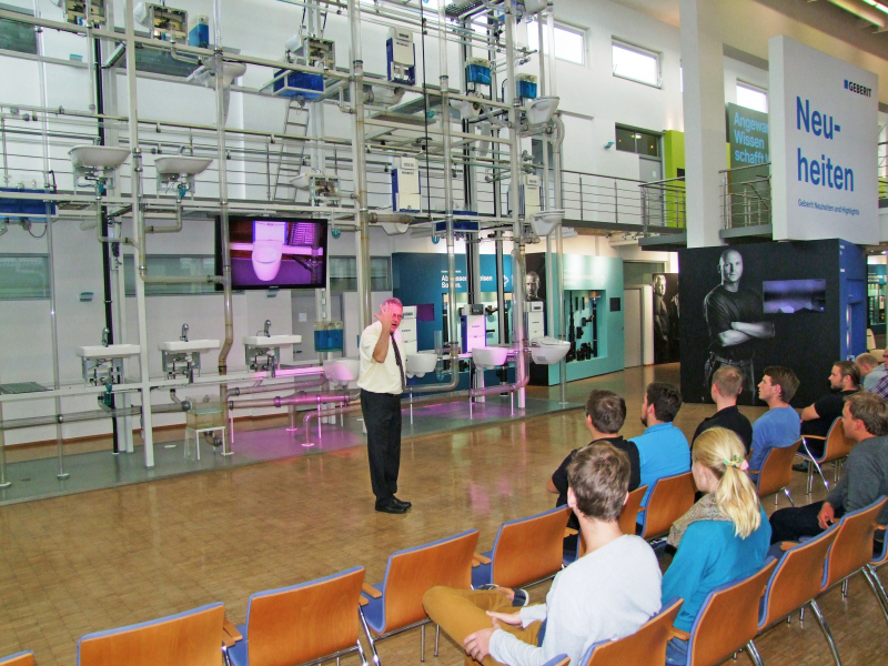 Praxishinweise zur Planung und Installation von Sanitäranlagen, insbesondere unter schall- und brandschutztechnischen Aspekten, wurden von der Fa. Geberit in Pfullendorf in mehreren Vorträgen dargelegt sowie das Thema „Hydraulik in Abwasserleitungen“ am Abwasserturm eindrucksvoll gezeigt und erläutert. Die Hydraulikwand entspricht in ihren Dimensionen einem vierstöckigen Mehrfamilienhaus. Zusätzlich gab es Auskünfte über die neuesten Produktentwicklungen des Unternehmens Geberit