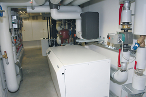 Für den Heizbetrieb wird der Vorlauf im zentralen Technikraum auf eine einheitliche, witterungsgeführte Vorlauftemperatur geregelt. Pro Haus ist ein Heizkreis vorgesehen. „Die drei Heizkreise sind so aufeinander abgestimmt, dass alle die gleiche Rücklauftemperatur haben“, berichtet Martin Böcker. Für den Heizbetrieb mit den Wärmepumpen stehen drei Leistungsstufen zur Verfügung. Die Sole-/Wasser-Wärmepumpe hat zwei Stufen mit je 41 kW. Als dritte Stufe kann die „ThermSelect“ zugeschaltet werden. Die bisherigen Erfahrungen zeigen jedoch, dass die zweite Verdichterstufe nur an sehr kalten Tagen zugeschaltet werden muss.