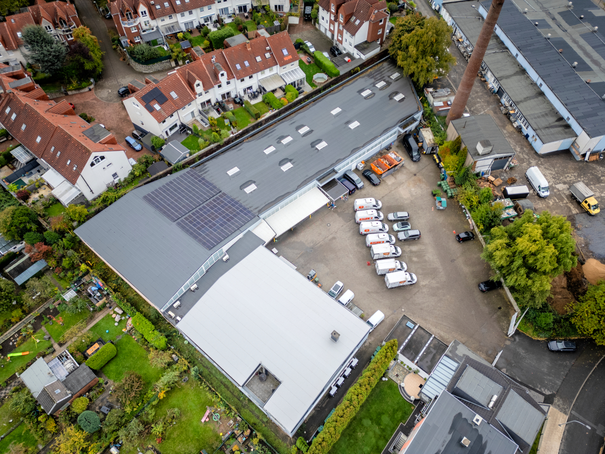 Das Betriebsgelände der Tafel Bochum & Wattenscheid e.V. von oben mit der 50 kWp starken PV-Anlage auf dem Dach.