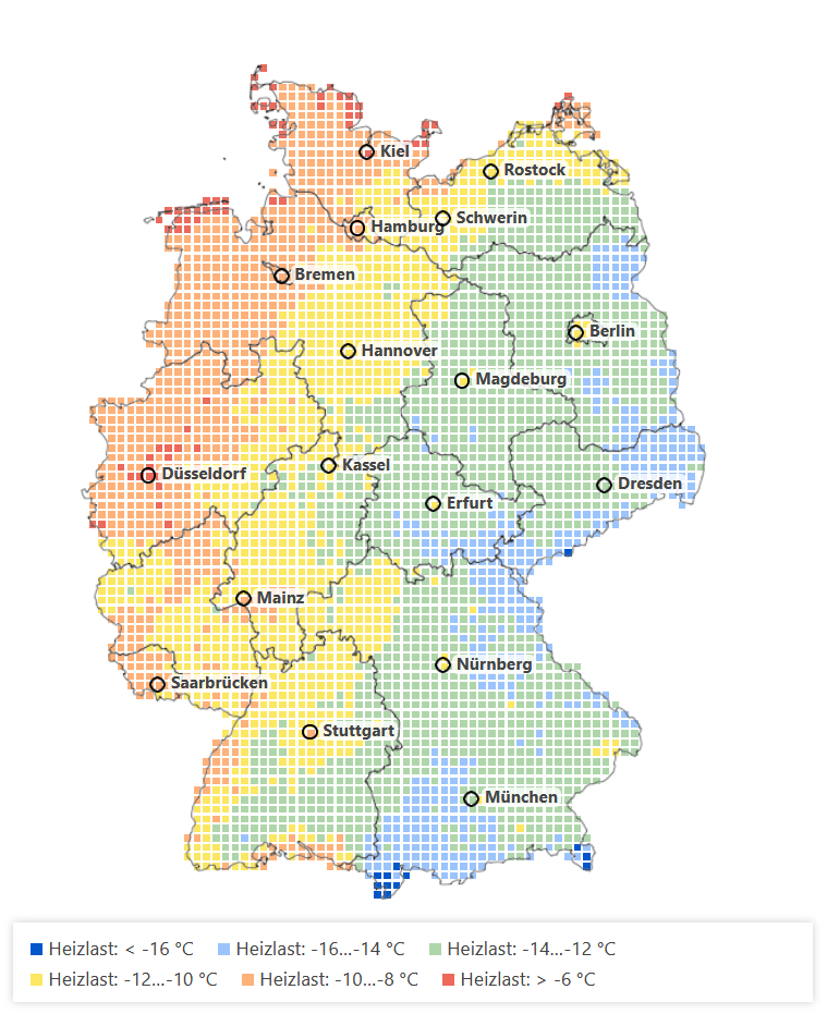Bisher gilt für den Standort Potsdam die Norm-Außentemperatur von -12,5 °C nach DIN EN 12831-1 [1] für die Ermittlung der Heizlast. Für die Norm-Außentemperatur der DIN EN 12831-1 ist geplant das 10. kleinste (entsprechend 0,18 % von 5.475 Tagen im Zeitraum) Tagesmittel zu wählen. Eine Auswahl des 10. kältesten Tages würde diese Temperatur auf -12,1°C erhöhen. Jedoch führt dies bei einer Raumzieltemperatur von 20 °C lediglich zu einer Reduzierung der Heizlast von 1,2 %. Bspw. würde die Heizlast von 1.000 W so nur um 12 W reduziert.
