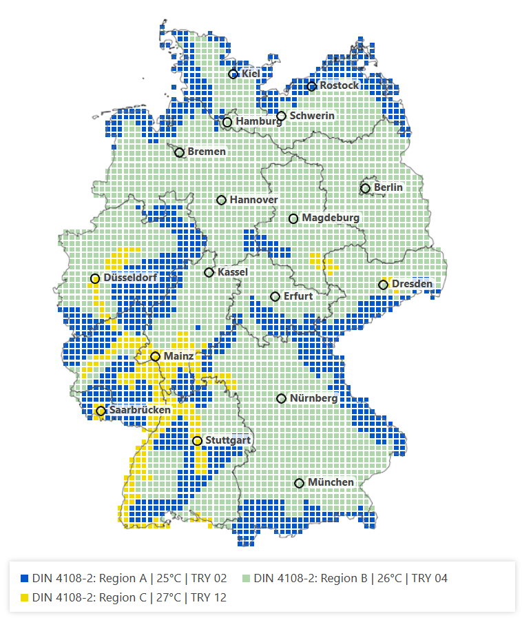 In diesem Beitrag wird nur auf die Außenlufttemperatur eingegangen und für die Dimensionierung im Winter, im Sommer und für die Energie und Häufigkeiten im Jahr bewertet. Die Deutschlandkarte (Bild 1) zeigt die Regionen im Vergleich, wie sie bisher als Vorgabe von den Normen und Richtlinien unterschiedlich vorgegeben werden. Die transparenten anschaulichen Darstellungen bieten eine gute Basis, um die Randbedingungen für die kritischen Tage im Heizfall und im Kühlfall festzulegen. Idealerweise sollte die Berechnungsmethode von Heiz- und Kühlenergie nach DIN V 18599 [4] dieselben stündlichen Klimadaten verwenden, wie die zum Nachweis des sommerlichen thermischen Komforts nach DIN 4108-2 [5]. Eine Stadt-Auswahl zeigt die Vorgaben auf einen Blick.
