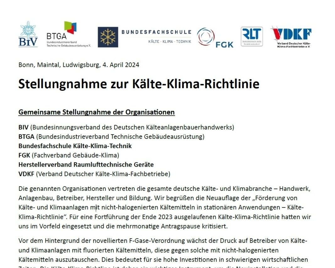 15.07.2024Im Rahmen der Kälte-Klima-Richtlinie wird der Einsatz von Klimaschutz-Technologien in gewerblichen Anwendungen gefördert. Konkret geht es dabei um die Förderung von Kälte- und Klimaanlagen mit nicht-halogenierten Kältemitteln in stationären Anwendungen. Für eine Fortführung der Ende 2023 ausgelaufenen Förderung hatten sich der Verband Deutscher Kälte-Klima-Fachbetriebe (VDKF) und die Landesinnung Kälte-Klima-Technik Hessen-Thüringen/Baden-Württemberg (LIK) beim Bundeswirtschaftsministerium (BMWK) erfolgreich eingesetzt und auch Anpassungen in der neuen Förderrichtlinie bewirken können, damit die Antragstellung unbürokratischer erfolgen kann.