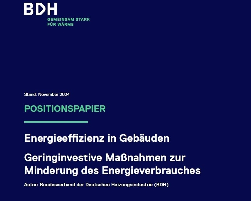 11.11.2024Der Bundesverband der Deutschen Heizungsindustrie (BDH) weist in einem veröffentlichten Positionspapier auf die Bedeutung von Energieeffizienzmaßnahmen in Gebäuden hin. Insbesondere vor dem Hintergrund des derzeit rückläufigen Marktes für Wärmeerzeuger und den zugleich ambitionierten Klimaschutzzielen spielten Energieeffizienzmaßnahmen eine wichtige Rolle, so der Verband. Zu diesen Maßnahmen gehören zum Beispiel der Tausch der Heizungspumpe, der hydraulische Abgleich oder die Optimierung der Regelungseinstellungen. „Der Fokus der energiepolitischen Debatte und der Öffentlichkeit lag zuletzt sehr stark auf dem Wärmeerzeuger. Dabei können bereits einfache und geringinvestive Maßnahmen zur Verbesserung der Anlageneffizienz in Gebäuden beitragen und Energieeinsparungen und Emissionsminderungen erzielen“, sagt Dr. Norbert Azuma-Dicke, Leiter Politik und Strategie im BDH und Vorsitzender der BDH-Arbeitsgemeinschaft Energieeffizienz. Die in der Arbeitsgemeinschaft organisierten Hersteller hatte das Papier gemeinsam erarbeitet.