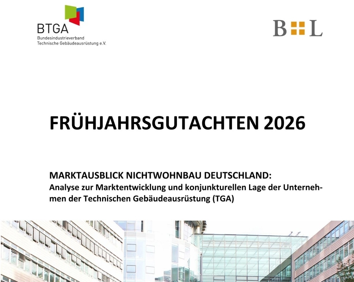 11.12.2025Der BTGA – Bundesindustrieverband Technische Gebäudeausrüstung e.V. hat am 11. Dezember 2025 die Ergebnisse seines Herbstgutachtens 2025 „Marktausblick Nichtwohnbau Deutschland“ vorgestellt. Die Prognosen für den Nichtwohnbau und den großvolumigen Wohnungsbau deuten darauf hin, dass 2025 das schwierigste Jahr der aktuellen Neubaukrise für die Unternehmen der TGA sein wird. Der Neubau in den Segmenten „großvolumiger Wohnungsbau“ und „Nichtwohnbau“ wird voraussichtlich erst 2027 wieder an Fahrt aufnehmen. Für das Jahr 2026 erwarten jedoch viele TGA-Fachbetriebe eine leicht positive Entwicklung der Auftragslage. Das dürfte vor allem auf den Rückgang der stornierten Aufträge und eine optimistischere Einschätzung der Planungssicherheit zurückzuführen sein.