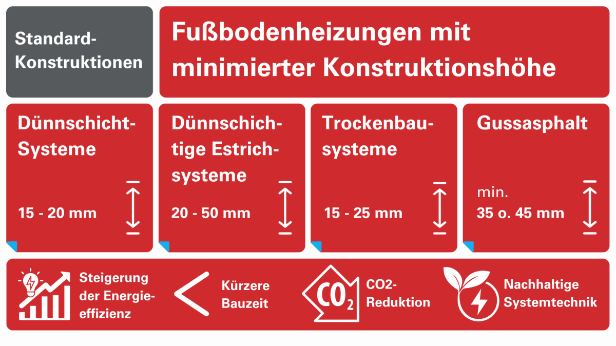 Diese Konstruktionen, in Anlehnung an DIN EN 1264, sind laut BVF grundsätzlich leichter und können dünner aufgebaut werden. Bei den verfügbaren Fußbodenheiz- und -kühlsystemen mit minimierter Konstruktionshöhe wird zwischen Dünnschichtsystemen, dünnschichtigen Estrichsystemen sowie Trockenbausystemen und Gussasphalt-Systemen unterschieden. Diese Systeme werden im Infoblatt kurz mit den relevanten Rahmendaten vorgestellt, so dass die grundsätzliche Eignung für den jeweiligen Einzelfall abgeschätzt werden kann.