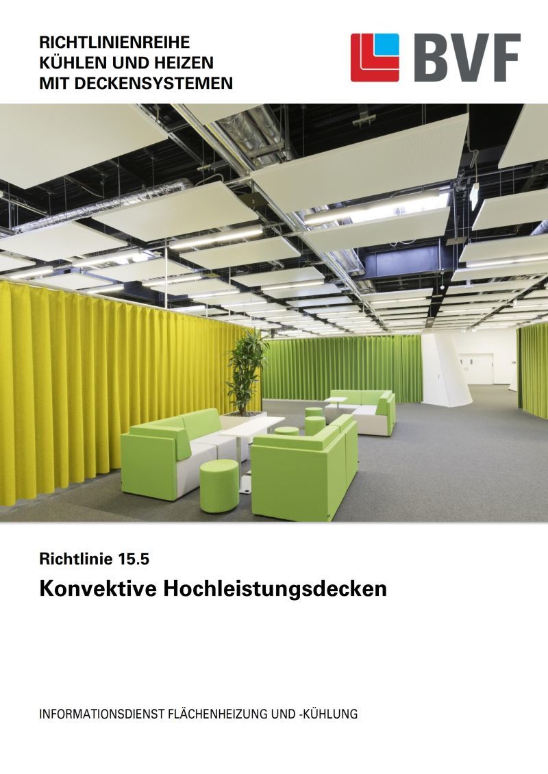 Der Bundesverband Flächenheizung (BVF) hat eine neue Richtlinie „ 15.5 Kühlen und Heizen mit Deckensystemen: Konvektive Hochleistungsdecken “ herausgegeben. Diese zeigt u. a., wie die Technologie das Abführen hoher Wärmelasten bei größtmöglicher Behaglichkeit ermöglicht. Anders als bei der geschlossenen Kühldecke wird aufgrund der offenen Deckenkonstruktion auch die dem Raum abgewandte Seite zur Kühlung und Heizung genutzt. Die Leistung summiert sich aus Strahlung und Konvektion und kann bis zu dem doppelten einer geschlossenen Kühldecke betragen.