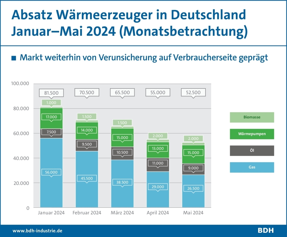 Auch moderne Brennwertheizungen auf Basis flüssiger oder gasförmiger Energieträger verzeichneten deutliche Absatzeinbrüche im zweistelligen prozentuellen Bereich. Mit 24.000 abgesetzten Geräten und einem Minus von 52 % entwickelte sich außerdem der Absatz von Biomasseheizungen rückläufig. Der Absatzrückgang bei den Wärmeerzeugern schlug auch auf die Heizungskomponenten wie solarthermische Anlagen, Heizungspumpen oder Lüftungssysteme mit Wärmerückgewinnung durch. Die geringe Neubautätigkeit verstärkte den Trend zusätzlich.