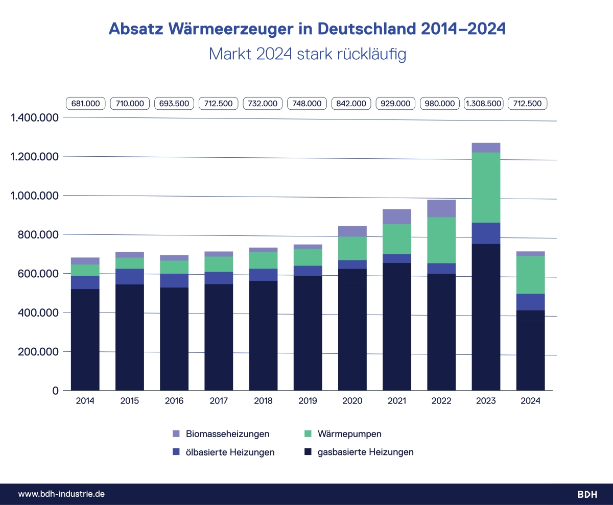 Die Hersteller in Deutschland setzten 2024 insgesamt 712.500 Wärmeerzeuger ab. Damit schrumpfte der Markt gegenüber dem Vorjahr um 46 %.