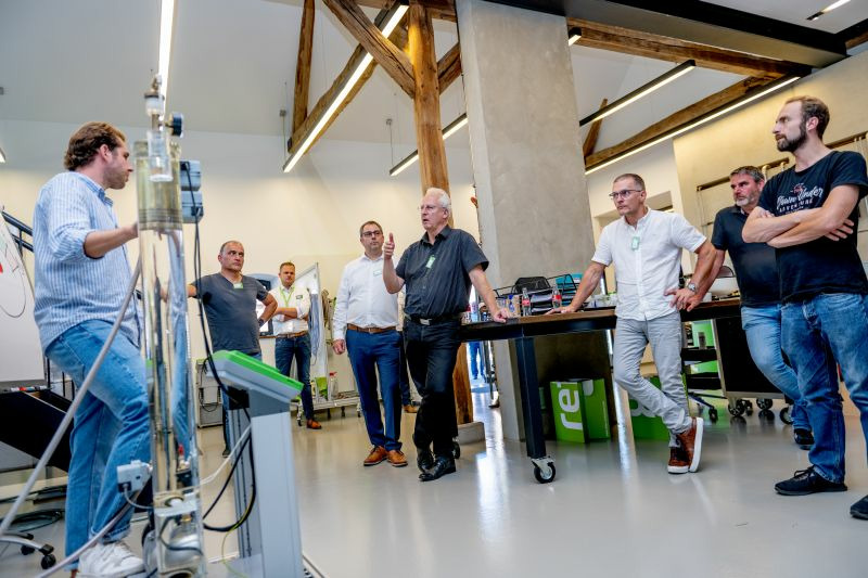 Fachlicher Austausch: Reflex-Referent Nils Busskamp (l.) erläutert das Prinzip der Servitec Vakuum-Sprührohrentgasung.