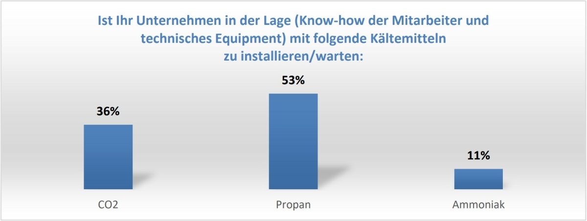Vor dem Hintergrund der novellierten F-Gase-Verordnung nimmt die Bedeutung der alternativen Kältemittel Kohlendioxid, Propan und Ammoniak zu. 36 % der Fachbetriebe sind bereits heute in der Lage CO2-Anlagen zu installieren und zu warten, 53 % beherrschen den Umgang mit Propan und 11 % haben das erforderliche Know-how im Umgang mit Ammoniakanlagen.