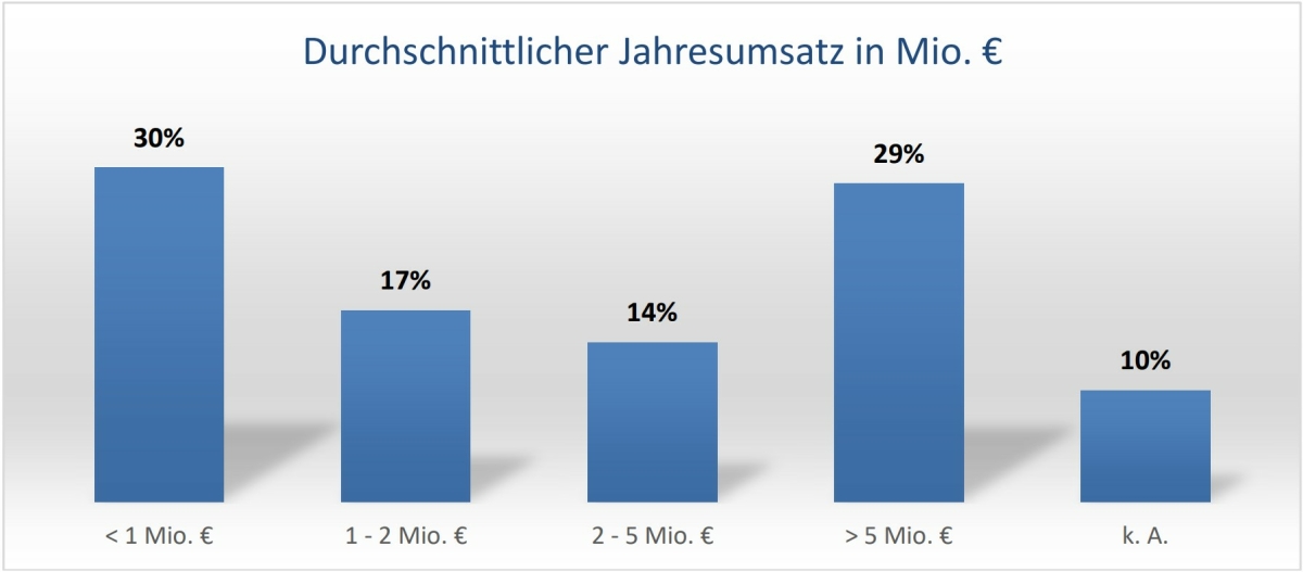47 % der teilnehmenden Unternehmen gaben an, 2023 einen Jahresumsatz bis 2 Mio. € erwirtschaftet zu haben. 14 % erzielten einen Umsatz von über 2 Mio. und weitere 29 % von über 5 Mio. €.