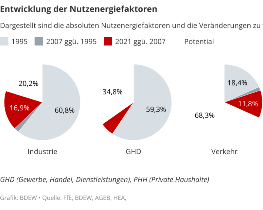 Das um die Nutzenergiebilanz erweiterte Energieflussbild zeigt auf, wie viel eingesetzte Energie im Laufe des gesamten Umwandlungsprozesses ungenutzt bleibt. Es lassen sich nach Angaben der HEA ganzheitliche Erkenntnisse über den Stand der Energieeffizienz in Deutschland gewinnen. Dabei gab es seit Veröffentlichung der letzten vollständigen Nutzenergiebilanz im Jahr 2007 Fortschritte zu beobachten: Der Nutzenergiefaktor (das Verhältnis der Nutzenergie zur eingesetzten Endenergie) lag in Deutschland 2021 bei rund zwei Dritteln. Zum Vergleich: 2007 betrug der Nutzenergiefaktor noch 51 %. Die Effizienz des Gesamtsystems (das Verhältnis von Nutzenergie zu Primärenergieverbrauch) hat sich von 2007 zu 2021 von 31 % auf 46 % gesteigert. Der Nutzenergiefaktor ist in der Industrie mit rund 80 % sei nach der Bilanz besonders hoch. Im Verkehrssektor hingegen werde weniger als ein Drittel der eingesetzten Endenergie tatsächlich genutzt bzw. in Antriebsenergie umgesetzt.