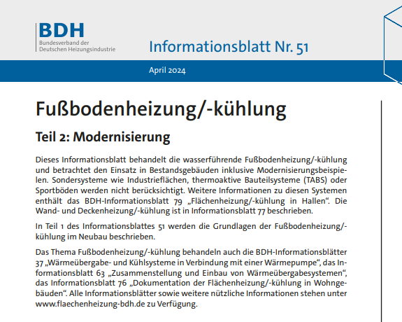 Hinweise zum energieoptimierten Einsatz im Neubau 03.07.2023Die Fachabteilung Wärmeübergabe des Bundesverbands der Deutschen Heizungsindustrie e. V. (BDH) hat das technische Informationsblatt Nr. 51 Teil 1 „Fußbodenheizung/-kühlung im Neubau“ in aktualisierter Version herausgegeben. Das Papier richtet sich an Fachhandwerker sowie Planer und Architekten und beinhaltet neueste Erkenntnisse zur Planung, Ausführung und Inbetriebnahme einer Fußbodenheizung/-kühlung im Neubau. „Das aktualisierte Informationsblatt reflektiert die aktuellen Erkenntnisse der Normung und gibt Hinweise zum energieoptimierten Einsatz einer Fußbodenheizung/-kühlung im Neubau“, sagt Frank Hartmann, Referent des BDH-Fachbereichs Flächenheizung/-kühlung. Das Informationsblatt steht auf der Website des BDH kostenfrei als Download zu Verfügung.
