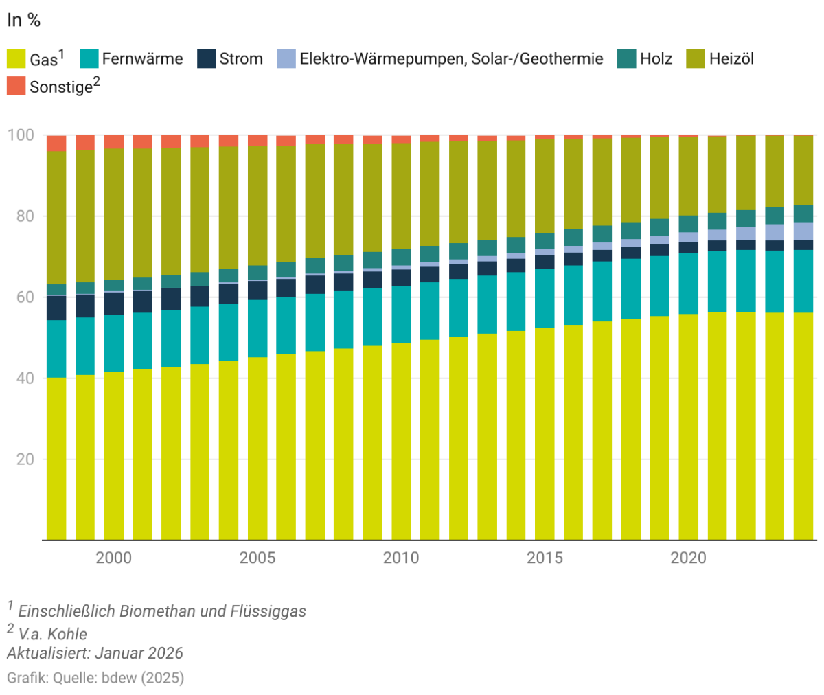 Entwicklung der Beheizungsstruktur des Wohnungsbestandes in Prozent.