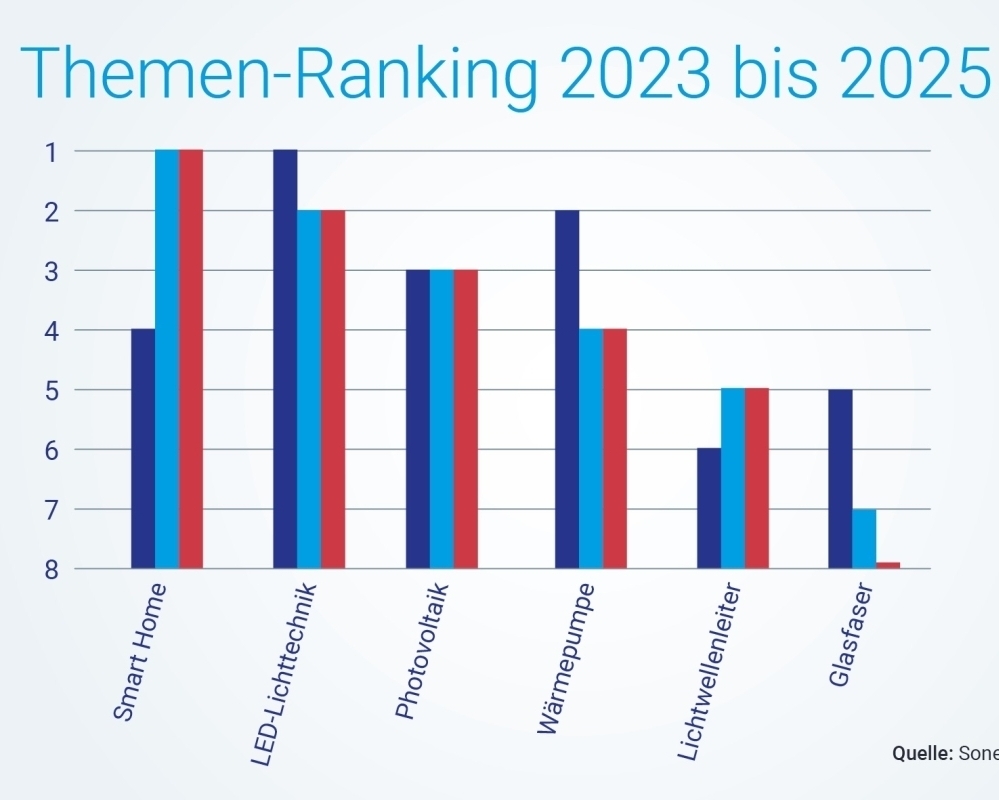 Smart Home, LED-Lichttechnik und Photovoltaik führen das Themen-Ranking des Trendreports 2023 bis 2025 an.