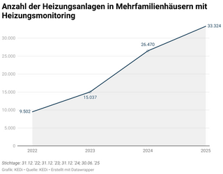 Die Heizsaison ist in vollem Gange und mit ihr ein bekanntes Problem: Die meisten Heizungsanlagen in Deutschland arbeiten ineffizient. Dabei sind digitale Lösungen zur Überwachung und Optimierung des Heizbetriebs längst verfügbar. Den aktuellen Stand zeigt die Umfrage “Digitales Heizungsmonitoring in deutschen Mehrfamilienhäusern” des Kompetenzzentrums für Energieeffizienz durch Digitalisierung (KEDi) unter Technologieanbietenden. Positiv ist, dass die angebotenen Lösungen mehr in die Anwendung kommen – in den vergangenen 3 Jahren verzeichneten die teilnehmenden Unternehmen jährliche Wachstumsraten von über 50 %. Allerdings geht dieses Wachstum von einem niedrigen Gesamtniveau aus, und es wären deutlich höhere Zuwachsraten möglich. Laut Umfrage sind digitale Lösungen derzeit nur in knapp über 4 % der Mehrfamilienhäuser im Einsatz.