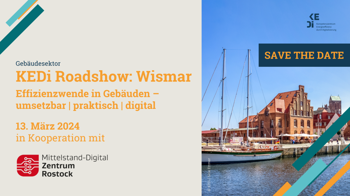 „Effizienzwende in Gebäuden – umsetzbar | praktisch | digital“ – mit diesem Leitbild startet die KEDi Roadshow 2024. In Kooperation mit dem Mittelstand-Digital Zentrum Rostock findet die Roadshow für den Gebäudesektor am 13. März von 10 bis 16 Uhr in Wismar statt. Neben Impulsen und Diskussionen zum Leitthema „Energiebedarfssenkung im Wohnungsbestand“ wird es eine begleitende Ausstellung geben. Die (vorläufigen) Programmpunkte sollen Antworten auf u. a. folgende Fragen geben: