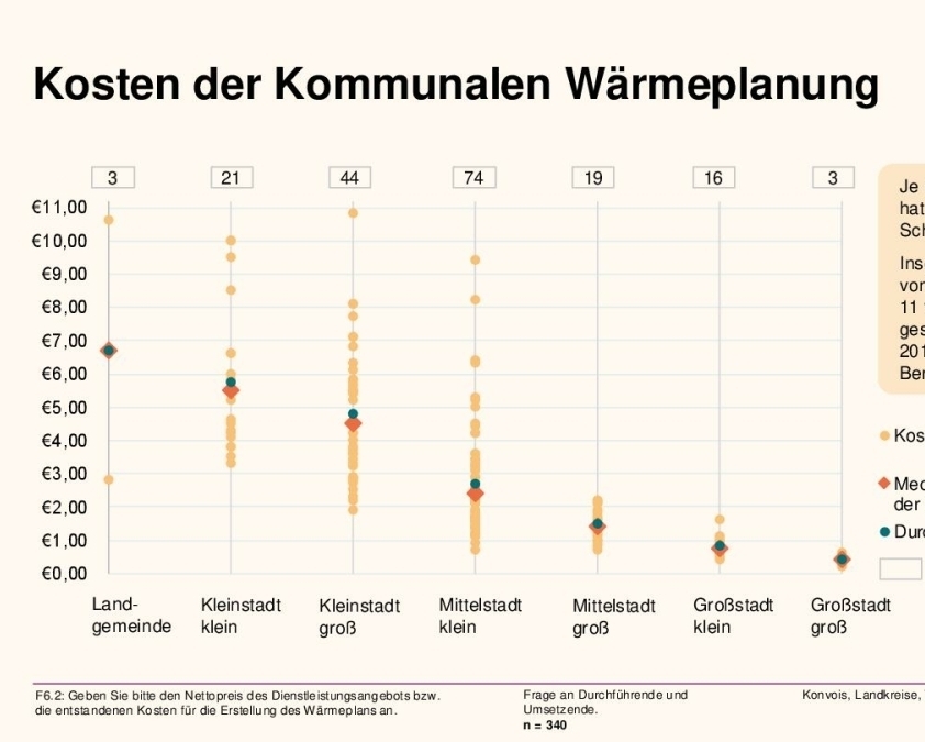 Nach Analyse des KWW bzw. Dena sind die Kosten der Kommunalen Wärmeplanung von 2023 auf 2024 um 11 % gestiegen, im Median um 1 % gesunken.