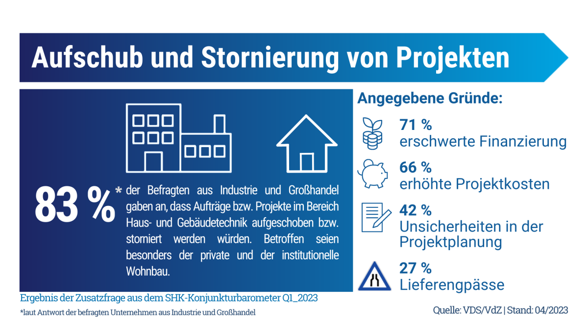 Das Geschäftsklima in der Haus- und Gebäudetechnik ist im Vergleich zu den Vorquartalen leicht angestiegen. Mit +29 Punkten liegt das Geschäftsklima jedoch 20 Punkte unterhalb des Vorjahresquartals. Als Ursachen werden die großen Unsicherheiten im Marktumfeld angegeben. Die daraus resultierenden Auswirkungen auf die Umsetzung von Projekten seien enorm. Die Aufschub- oder Stornierungsquote lag nach Einschätzung der Befragten zu Jahresbeginn bei über 80 %. Im ersten Quartal 2022 betrug die angenommene Aufschub- und Stornierungsquote noch 60 %. Zu diesem Ergebnis kam die Sonderauswertung des aktuellen SHK-Konjunkturbarometers für das 1. Quartal 2023.